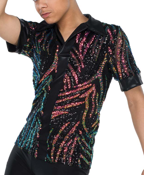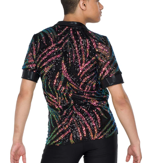 Lined sequin swirl mesh and foil lycra collared shirt.